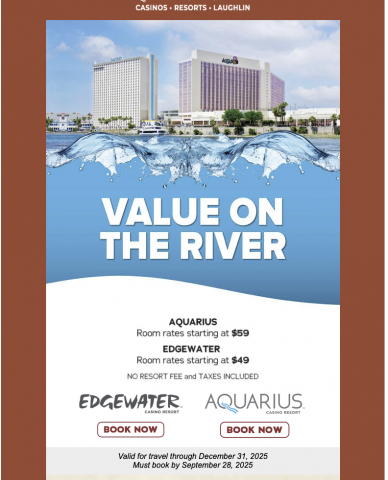 Laughlin Overnight at the Aquarius, Special pricing if booked by Sept 28th. $89.00 including resort fees and taxes. Use booking code EB0925E. We will take an indirect route down to Laughlin.